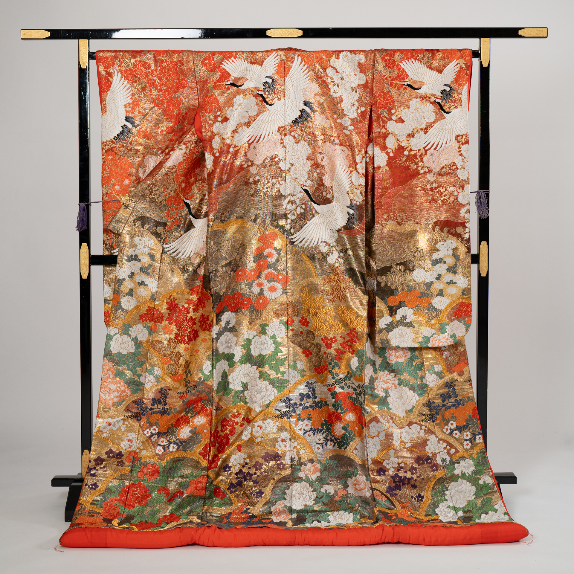 新入荷の色打掛。雪輪青海波に四季の花が描かれ、定番の飛鶴の柄。色が少し渋めでかっこよさもあります。こちらもブライダルフェアにお越しいただきましたら無料でご利用いただけます。