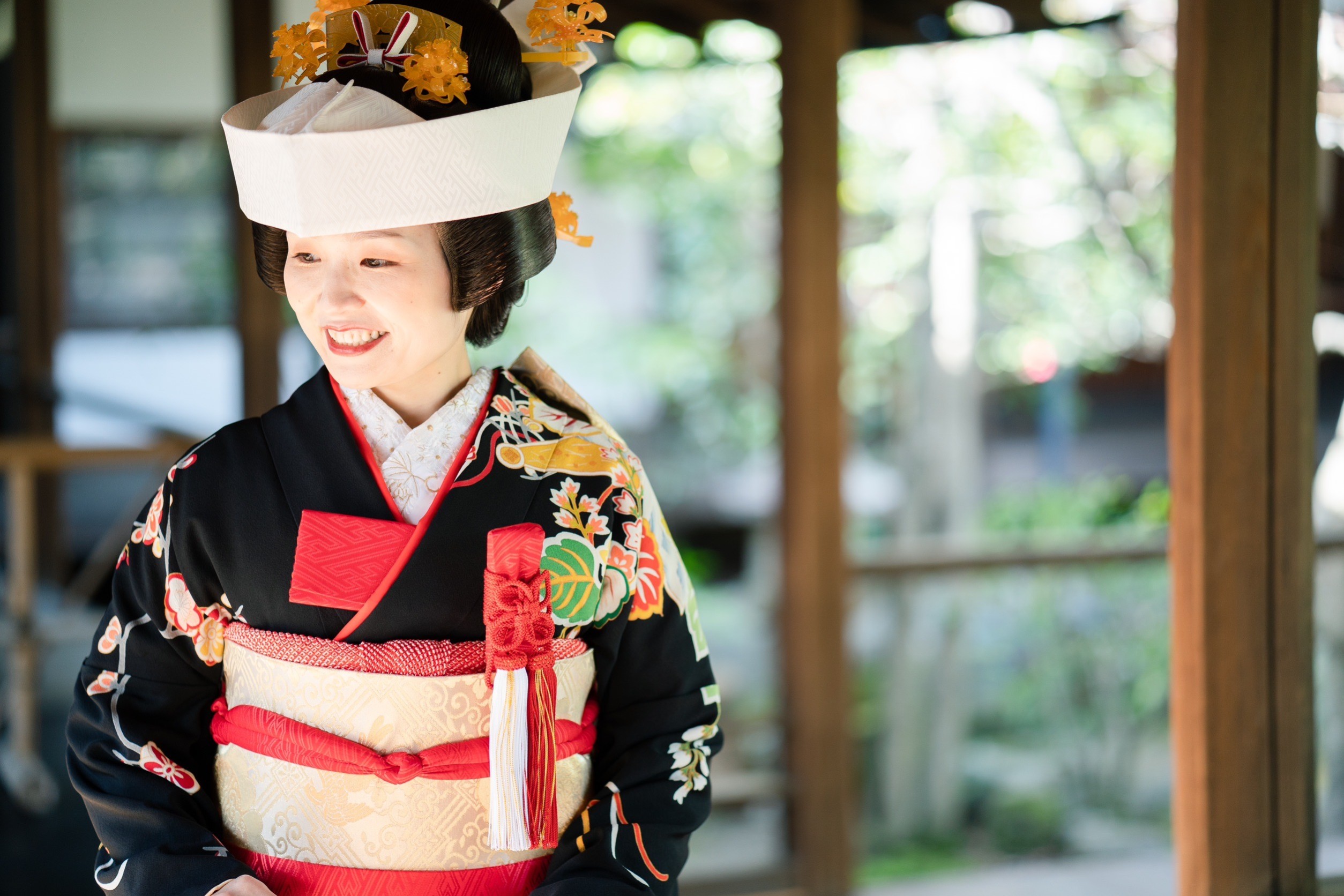 京都の本法寺前撮りイメージ。広い縁側で白無垢と色紋付の衣装にて。