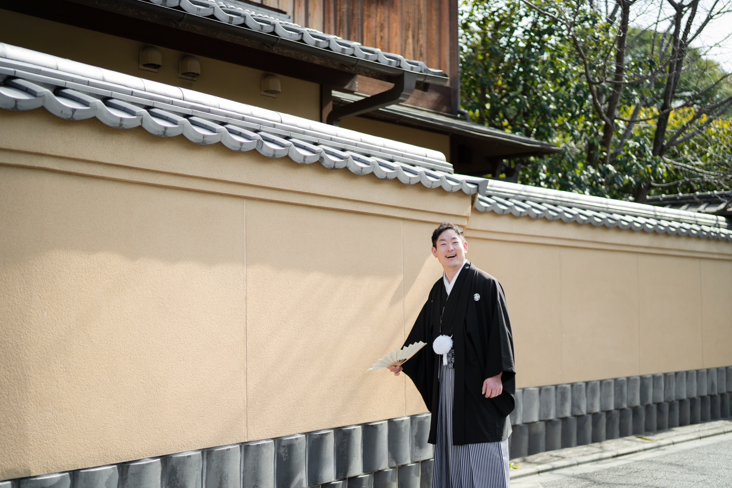 秋の本法寺前撮りイメージ。白無垢と黒紋付袴スタイル。