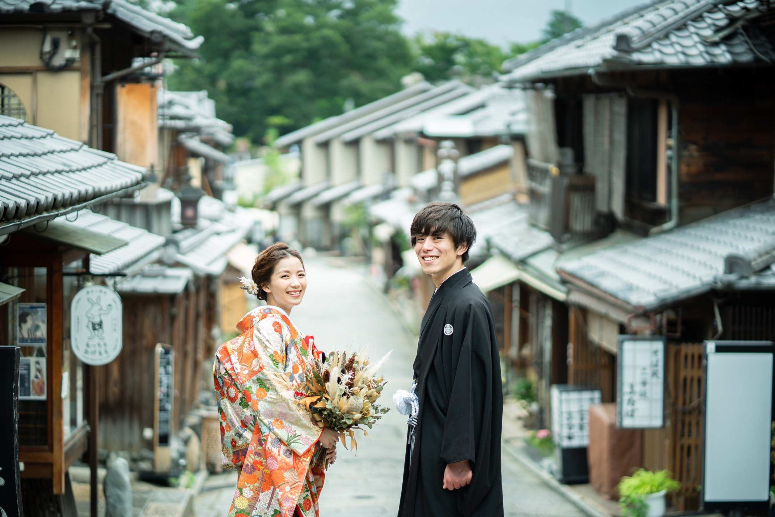 八坂通から産寧坂へと続く道は、八坂の塔が見える絶好の前撮りポイント。
